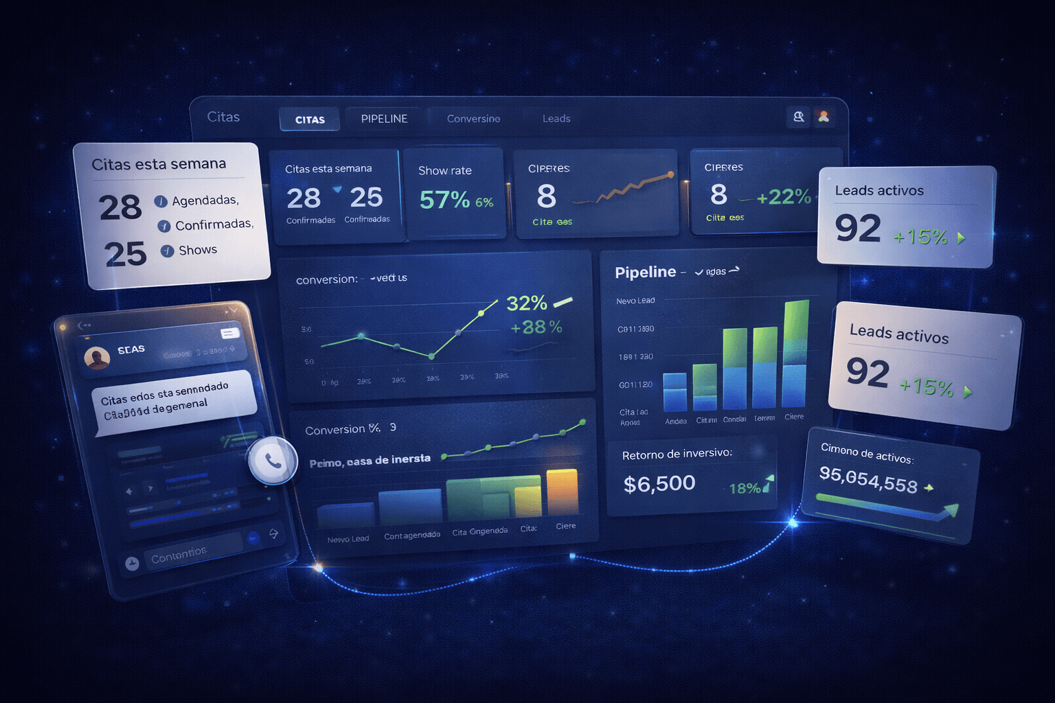 Después conectamos todo: infraestructura publicitaria, respuesta inmediata, appointment setting, CRM, confirmaciones, recuperación de no-shows, seguimiento comercial y visibilidad real del pipeline.